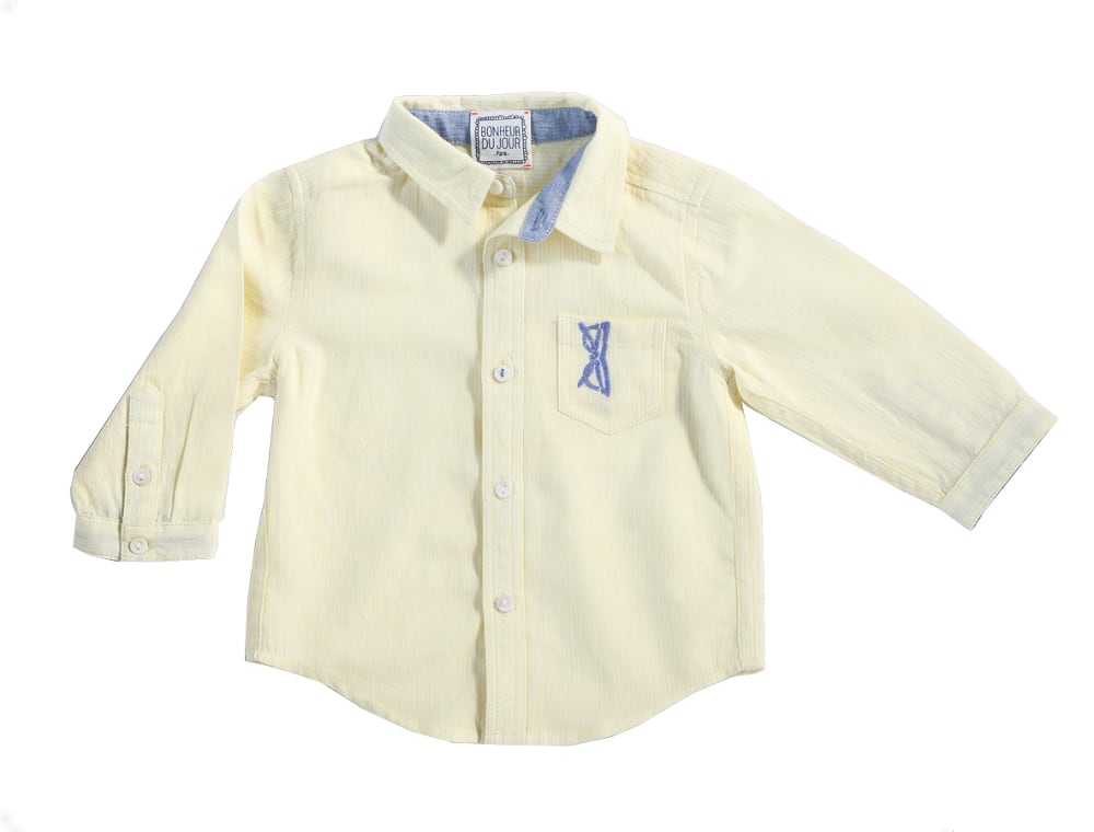 フランスのセレブ子供服ブランド BONHEUR DU JOUR ボヌールドゥジュールのシャツ SUNGALLSES イエローです。胸ポケットにサングラスの刺繍、襟のカラーには色違いの布を配色したお洒落なシャツです。