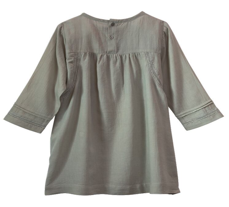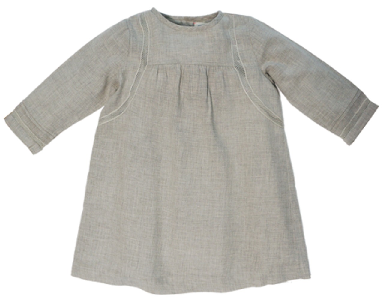 シックなグレイの生地にヨークと袖に白いレースをあしらった上品なワンピース"MAONA"
