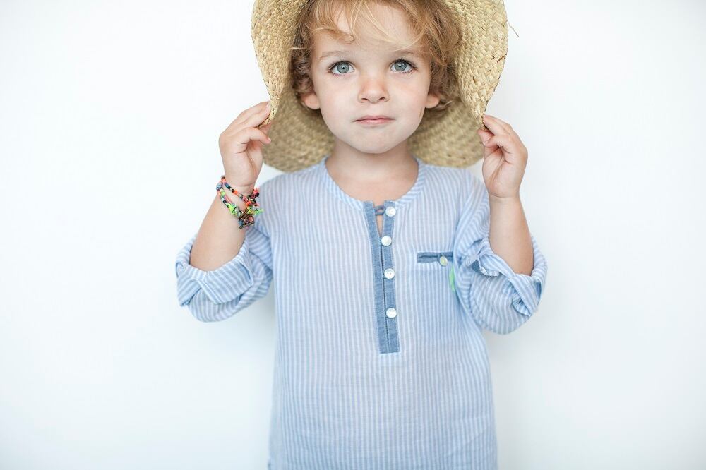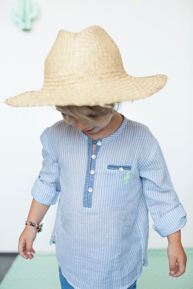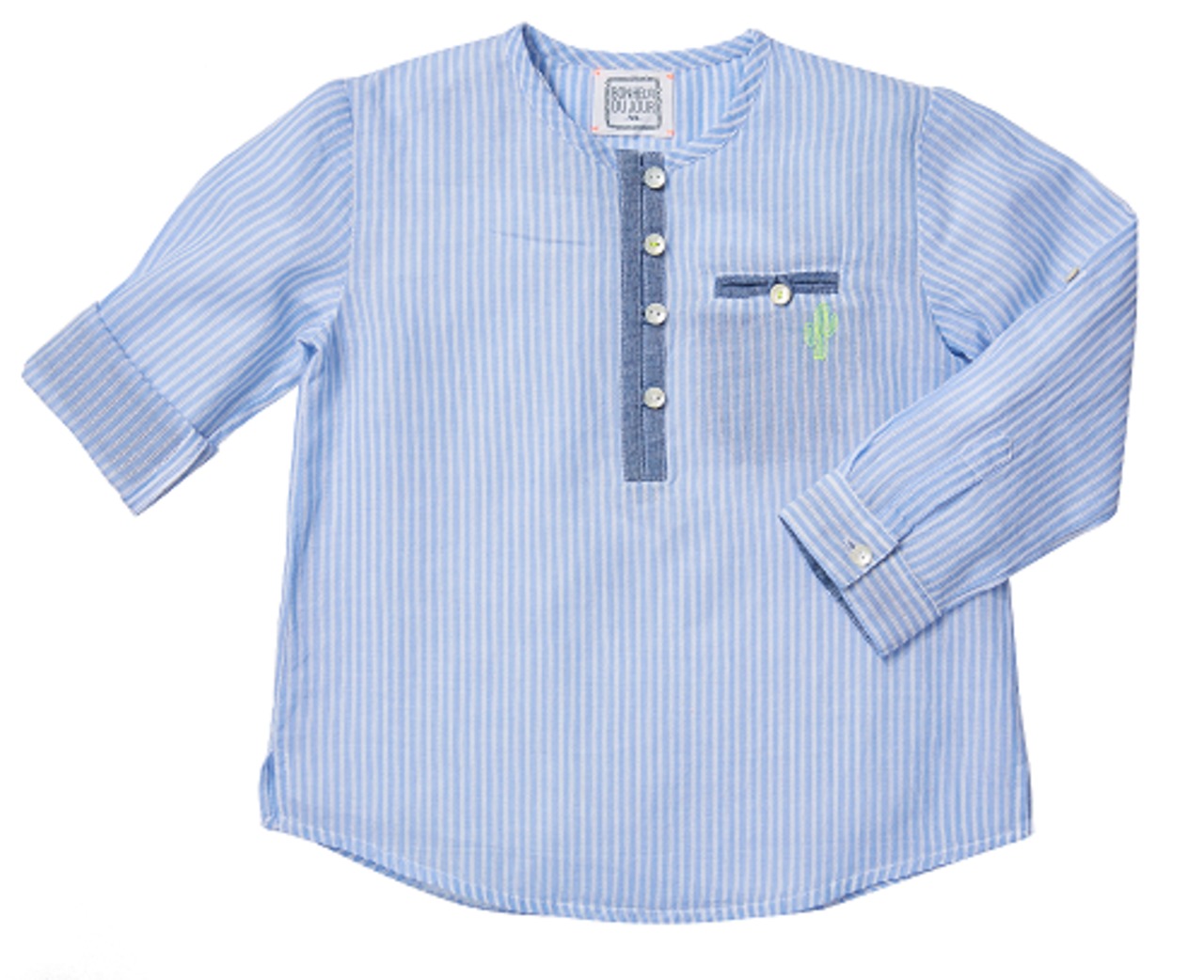 爽やかなブルーストライプの生地に、胸元にはボタンを並べ、胸にはサボテンの刺繍がきいているシャツ "HUGO" です。長袖は、折り返してボタンで留められます。